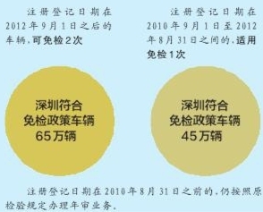 深圳市交警局车管所刘警官介绍,非营运轿车等车辆6年内免检政策自2014年9月1日起实施。注册登记日期在2012年9月1日之后的车辆,可以免检2次;注册登记日期在2010年9月1日至2012年8月31日之间的,可以适用免检1次;注册登记日期在2010年8月31日之前的,仍按照原检验规定办理年审业务。据统计,深圳符合该6年内免检政策的机动约110万辆,其中符合免检2次的约65万辆,符合免检1次的约45万辆。